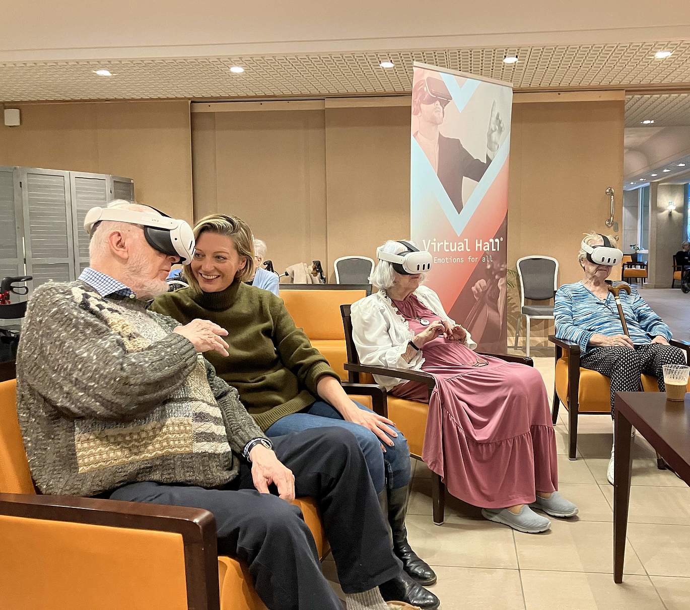Equipés de casques de réalité virtuelle, les bénéficiaires ont pu vivre une expérience inédite mêlant musique classique et innovation technologique. Le matin à la Résidence Colladon, puis l’après-midi à l’EMS, la découverte de Virtual Hall®, première application de réalité virtuelle consacrée au spectacle vivant, a permis aux bénéficiaires et au personnel de la MRPS une immersion sur scène, aux côtés des musiciens et musiciennes, face au chef d’orchestre.